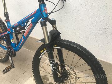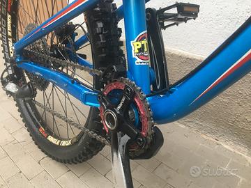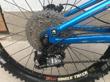 Monta forcella Fox Float 32 100mm (può ospitare anche cerchio da 26") e ammortizzatore Rockshox Monarch 100mm recentemente revisionati e preparati da Solosterro. Guarnitura monocorona Race Face 30t cambio Sram X9 10v pacco pignoni Sunrace 11-46. Freni Shimano Slx disco 203mm anteriore e 160mm posteriore. Gommata Schwalbe Hans Dampf 24x2,35 posteriore al 90% e Maxxis Minion DHF 24x2,40 anteriore al 70%, entrambi tubeless e con mousse PTN. Reggisella telescopico KS 125mm. Insieme fornisco un set supplementare di cerchi montati con camera d'aria, gomme piú stradali e pacco pignoni 11-42 e 4 pneumatici assortiti di cui due praticamente nuovi.