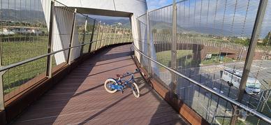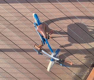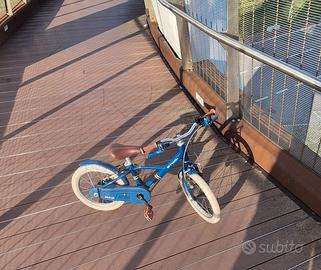 Btwin 900 city bici leggera e facile da manovrare per bambini da 4 a 6 anni (da 105 a 120cm di altezza). Il telaio è in alluminio verniciato blu stile vintage, sui metalli non protetti dalla vernicee è presente qualche punto di ossidazione, causa vicinanza al mare. Le ruote sono da 16 pollici e pesa solo 7,3 kg. Dotata di dotata di carter catena, cavalletto e parafango. Regalo optional comprati nel tempo come ruotine laterali e asta sostegno del genitore.