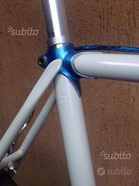 Vendo bicicletta a scatto fisso colore bianco e blu perlato con ricami in risalto unica introvabile non le compri queste le le fai fare dagli artigiani su richiesta!!! Numerata artigianato italiano non le cinesate da 300€