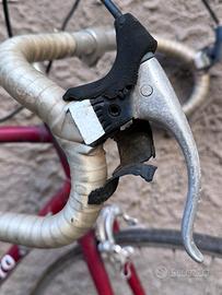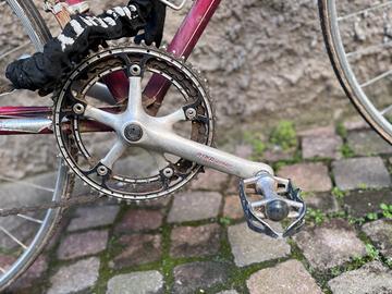 Bicicletta aggio-Fulvio, 56 con pedali RINO aereo, piastrine dei freni poco usate, ma i fili sarebbero da cambiare perché arrugginiti, ma tubolari delle ruote entrambi bucati. I tubolari sono quelli che si attaccano con la colla al cerchione. Rosso bordeaux. Bellissima.