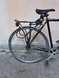 Bicicletta artigianale in acciaio con telaio columbus; usata pochissimo; pari al nuovo; Altezza 28”; Cambio integrato nel mozzo ruota a 3 velocità;corredata di vari accessori di ricambio nuovi.
