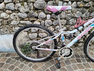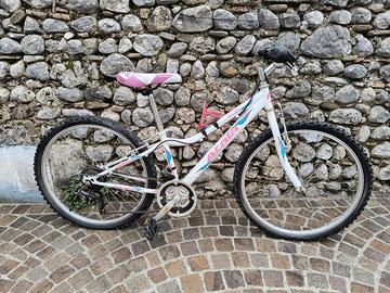 Ruote taglia 24 **Condizioni:** La bici è **perfettamente funzionante** dal punto di vista meccanico: le ruote girano, i freni e il cambio funzionano, ma ha **una pulizia approfondita e una lubrificazione**. Come visibile dalle foto, presenta evidenti segni di usura, un po' di ruggine superficiale sulle parti metalliche e polvere accumulata. Il sellino ha una leggera scalfittura e la catena necessita di lubrificazione. **Caratteristiche Principali:** * Telaio in acciaio * Ruote da 24 pollici * Cambio a 6 velocità * Freni V-brake. * Accessori inclusi: portaborraccia rosa, cavalletto. Si prega di guardare attentamente le foto per valutare lo stato attuale. La bici viene venduta "vista e piaciuta" nello stato in cui si trova. non spedisco