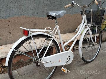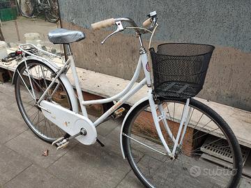 Vendo bicicletta da donna bianca completamente revisionata e perfettamente funzionante. Cerchi in acciaio da 26 ", copertoni e freni molto buoni, portapacchi posteriore a molla con catarifrangente, sella ricoperta, non ha cambio. Il cestino anteriore, i fanalini LED e il campanello sono tutti nuovissimi. Soddisfatti o rimborsati assistenza e riparazioni gratuite per il primo mese. Zona Fiera Portello Stanga.