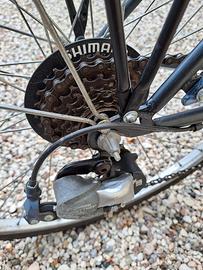 Bici nera con cambio shimano, fanalino anteriore e posteriore. Dotata di porta pacchi posteriore e cestello anteriore. Selettore velocità sulla manopola destra.