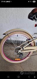 La bicicletta è pari al nuovo perché è stata usata pochissimo e tenuta sempre in garage. Un vero affare. Bicicletta B'twin Poply 500 da 24 pollici con cambio a 5 rapporti per bambina 8 /11 anni. Ideale per passeggiate e apprendimento. Colore crema con dettagli rosa. Sella marrone. La bici ha le ruote larghe che danno stabilità e permette un uso sicuro anche in strade non asfaltate Vendo bici per bambino/a in ottime condizioni, alcune specifiche: ✔ Telaio ribassato per salire e scendere facilmente ✔ Freni V-Brake efficaci e leve adatte alle mani dei bambini ✔ Cambio a 5 velocità con comando girevole semplice ✔ Sella ergonomica molto comoda e manubrio x condurre con una schiena dritta Accessori inclusi: Cestino Parafanghi Cavalletto Luci e catarifrangenti Dimensioni: 160 x 100 x 56 cm Bici completa e pronta per essere utilizzata subito