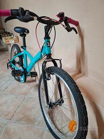 Caratteristiche: È una bici da bambina con telaio in acciaio, freni V-Brake, 5 marce, protezione della corona con design decorato e sella comfort rinforzata.La bicicletta è di colore turchese con dettagli rosa sul sellino e sul manubrio.