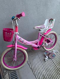 Vendo bici bambina 16” in buone condizioni, con cestino e seggiolino bambole posteriore, e rotelle. Campanello e gomme nuovi!
