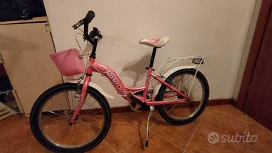 Vendo biciclette rosa e bianca per bambina, dotata di portapacchi posteriore e cestino anteriore.