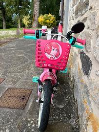 Vendo bicicletta bambina con rotelline, ruote diametro 14, completa di cestino portaoggetti, specchietto retrovisore, luce posteriore, catarifrangenti alle ruote e campanello.