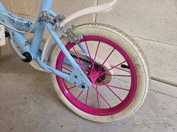 bicicletta frozen con raggio ruota 14. usata ma complessivamente in buono stato . cestino rotto. compresa di ruote laterali posteriori
