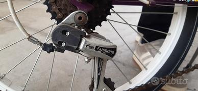 Bicicletta da bambina ben tenuta. ruote 20x1.75 pollici (47=406). colore viola metallizzato e bianca con cestino anteriore, portapacchi posteriore e cavalletto. cambio Shimano 6 rapporti.