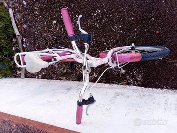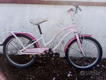 Bicicletta per bambina colore rosa Hello Kitty misura ruota 20”. Completa di portapacchi posteriore, cavalletto e catarifrangenti. Usata, funzionante e in condizioni discrete (tracce di ruggine, graffiata e filo del freno posteriore da sostituire).