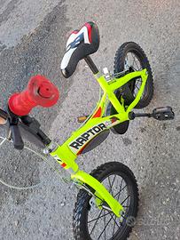 Bicicletta Dino bikes per bambino, Raptor, ruote da 14'', colore giallo fosforescente, due freni al manubrio, ideale per imparare a pedalare, piccoli segni di usura come da foto