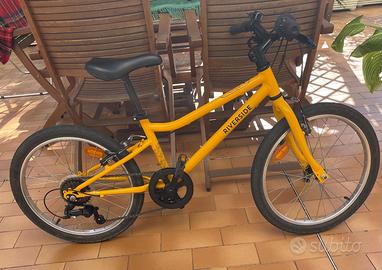 Bicicletta bambino Riverside 120 norme europe 20”, per bambino dai 6 ai 9 anni, colore giallo, usato come nuovo. Kit di protezione (gomitiere e ginocchiere) taglia xs (peso tra 25kg e 50kg) e caschetto di protezione taglia xs (48-52 cm) nuovi.