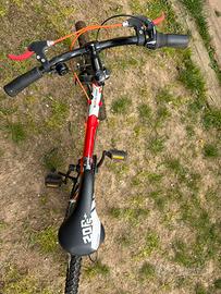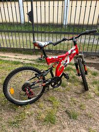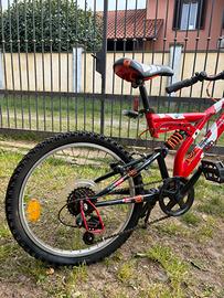 Ammortizzatori: È una bici "full suspended", ovvero biammortizzata. Ha sia la forcella anteriore ammortizzata che un molleggio centrale (l'ammortizzatore a molla arancione sotto il sedile). o Ruote: Sono da 20 pollici, la misura classica per bambini dai 6 ai 9 anni circa (altezza tra 120 e 135 cm).