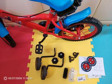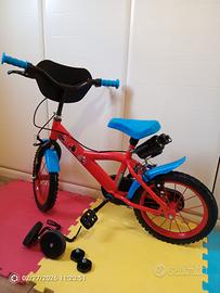 Bicicletta per bambino rossa e azzurra con Spiderman , ruote da 14 ", con borraccia, rotelle, istruzioni, adesivi e accessori