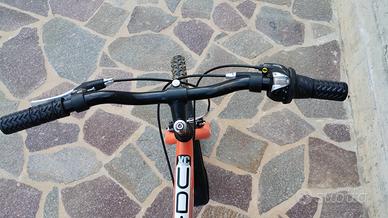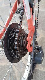 Mountain bike sportiva di marca **DoubleZZ**,, dal design robusto e moderno. Telaio arancione con dettagli neri e bianchi. Dotata di parafanghi anteriore e posteriore, gomme tassellate ideali per fuoristrada, e una sella ergonomica con un look nero e arancione. Include cavalletto, cambio Revoshift Shimano 6 velocità. Perfetta per gli amanti dell'avventura! Per ogni ulteriore info, contattatemi...