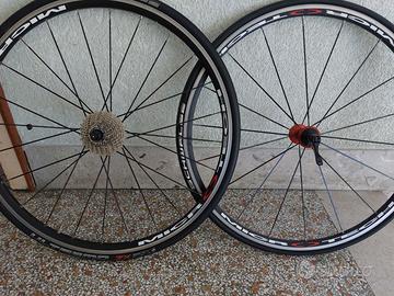 misura 53, montata Ultegra 11 velocita 50/34 la moltiplica e pacco pignoni 11/28, copertoni continental nuovi su ruote profilo alto 50 Microtech, cavi e guaine appena sostituiti come la catena, con seconde ruote alluminio con pacco pignoni nuovo 11 velocita 11/28