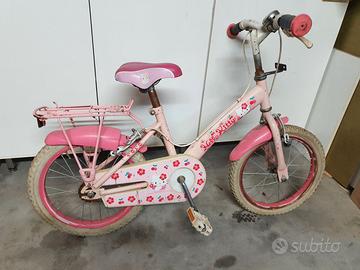 Bicicletta da bambina di Hello Kitty bianca e rosa. Parafanghi anteriore e posteriore rosa. Il gattino oggetto di culto a livello internazionale accompagnerà le piccole cicliste verso splendide avventure.