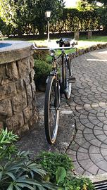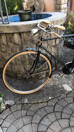 Bicicletta vintage Edoardo. Bianchid’epoca con piccolo borsetto dietro il seggiolino con freni a bacchetta .Presenta alcuni segni d’usura sul telaio e sul seggiolino