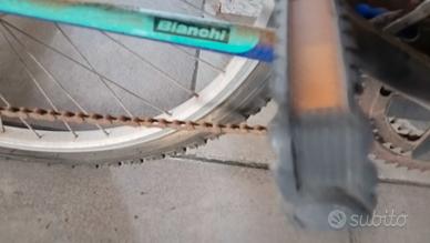 bicicletta Bianchi colore blu e verde ha bisogno di essere sistemata funzionano solo i freni le gomme sono a terra e c'è un po' di ruggine qua e là
