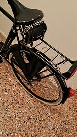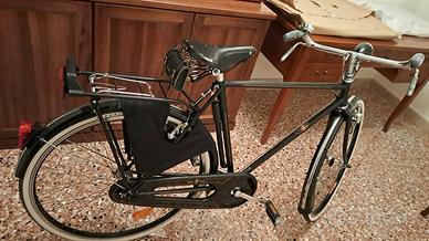 bicicletta Bianchi da uomo colore nero metalizzato, stile classico, manubrio cromato con freni a bacchetta, sella inglese in cuoio con molle. Perfettamente nuova come da negozio e mai corso. Per chi ama lo stile old Italy e' la bici ideale