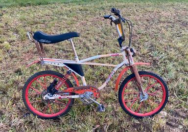 Bicicletta Bici vintage Saltafoss Salta Foss Speed Cross Speedcross Con cerchioni in lega con razze, freni a tamburo anteriori e posteriori, ammortizzatori anteriori e doppi posteriori perfetti, luci faro, due parafanghi in ferro, sella, carena anteriore con numero, varie plastiche, manopole, vari adesivi tutti, ecc.. il tutto originale. Completa di tutti i suoi pezzi componenti originali dell'epoca. In buono stato. Molto rara difficile da trovare soprattutto come questa completa. Se interessati chiedere il prezzo
