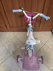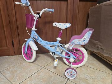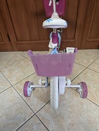 vendo bicicletta da 14" fantasia Frozen, equipaggiata con freni anteriori e posteriori tipo caliper, per una frenata efficace e sicura, stabilizzatori laterali removibili, coperture con pneumatici a camera d'aria gonfiabile, pratico cestino anteriore per trasportare giocattoli o piccoli oggetti e porta bambole posteriore.
