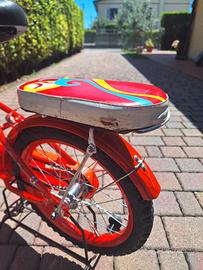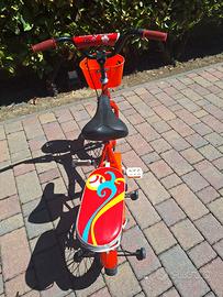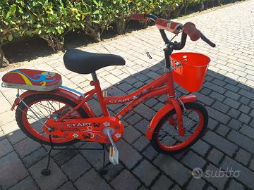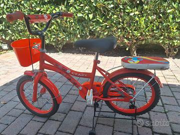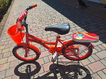 Bicicletta bambina con ruote 16 pollici funzionante, in discreto / buono stato con freno anteriore di tipo normale per quello posteriore si inverte il movimento di pedalata ( contropedale))come si vede dalle immagini con qualche striscio e il seggiolino posteriore non proprio al top