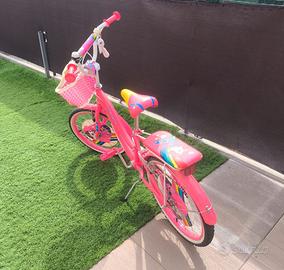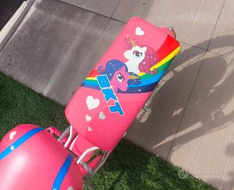 Bicicletta UNICORNO BKT taglia 20 bici per bambina Con cestino età 7 - 13 anni Bici Unicorno per bambine con doppio sella e cestino Descrizione Dettagli del prodotto La bicicletta Unicorno è caratterizzata da un look veramente femminile e raffinato, colorata sui toni che vanno dal bianco al rosa, al fucsia, ed è dotata di un delizioso cestino in vimini rosa, con applicazioni e stampe che lo rendono ancora più bello. Inoltre ha un portapacchi con cuscino posteriore, il campanello ed il cavalletto. Telaio in acciaio e freni V-Brake. Abbellita da decori, sarà perfetta per le ragazzine che amano pedalare in compagnia delle amiche e passeggiare all'aria aperta. CARATTERISTICHE: Telaio in acciaio Monovelocità Paracatena colorato Parafanghi anteriori e posteriori Gomme con camera d'aria Freni Caliper Cavalletto laterale Cestino anteriore colorato Doppia sella Sterzo e sella regolabili in altezza DIMENSIONI: Lunghezza 140 cm Altezza 87 cm Sella regolabile in altezza da 59 a 78 cm da terra