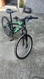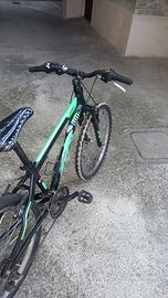 Bicicletta ben tenuta, cambio Shimano anteriore e posteriore, nera con grafiche verdi.