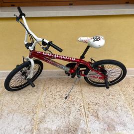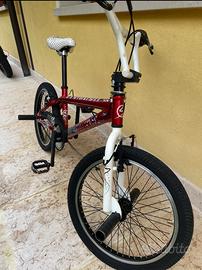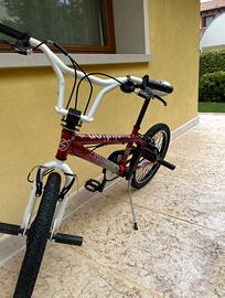 bici color rosso e bianco con vari dettagli celesti/azzurri, gialli e neri sul telaio e sulla sella.