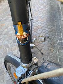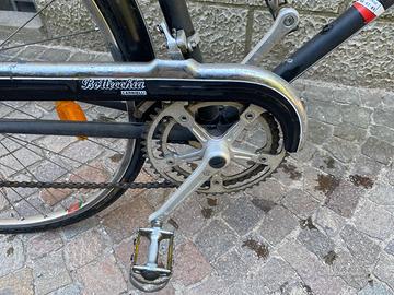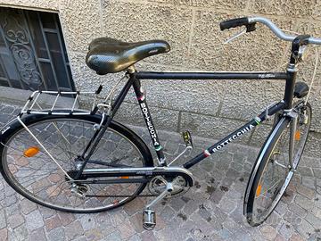 Splendida bicicletta da uomo Bottecchia originale degli anni '70, un classico intramontabile del ciclismo italiano. Telaio robusto in acciaio nero con decalcomanie originali e dettagli tricolore. Cambio posteriore funzionante, ruote da 28", portapacchi posteriore in metallo, parafanghi e sella imbottita comfort. Perfetta per gli amanti del vintage, collezionisti o uso urbano con stile retrò.