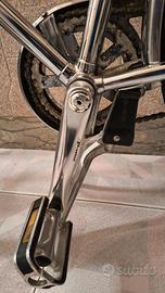 telaio, realizzato in acciaio temperato di alta qualità, è reso prezioso da una spessa cromatura eseguita interamente a mano in Italia e da saldature nobilitate da congiunzioni in stile anni ’50. Gli accessori di ultima generazione applicati alla bicicletta, rigorosamente realizzati in alluminio, rimandano a quelli originali, contribuendo a mantenere le biciclette leggere e donando una guida agile e fluida. Ilcuoioe lapellesono lavorati con sapienza artigianale: dalla pregiata sella Brooks alle manopole che, grazie a rifiniture sartoriali, garantiscono una presa comoda e particolarmente piacevole. PER ULTERIORI INFO RIMANDO AL "SITO" CIGNO BICI.
