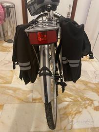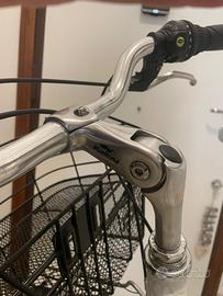 City bike donna, marca Delsante, telaio in alluminio in tonalità grigio-bianco, cerchi da 28, forcella rigida con guarnitura in alluminio 42 D, ruota libera Shimano TZ 60, 6 rapporti, comando cambio Shimano RS 66, cambio Shimano TY 21, manubrioin alluminio zoom, leve freno in resina/alluminio, freni V-Brake alluminio, cerchi in lega alluminio 6061 a 36 raggi, pneumatici 700 X 35 C Kenda neri, tubo sella in alluminio grigio, faretto anteriore e posteriore alimentato con dinamo, sella sportiva, chiusura di sicurezza con chiave. Inoltre, portapacchi posteriore con borse incluse, portapacchi anteriore con cestino a due comparti, cavalletto di stazionamento. Praticamente nuove (vedere pneumatici). Visionabile e ritirabile in zona Roma Talenti. Non si effettuano spedizioni.