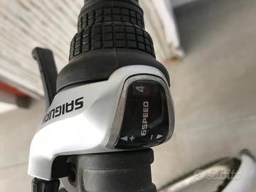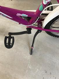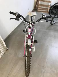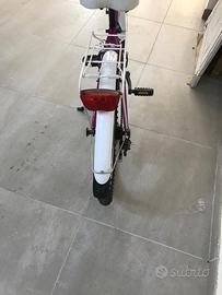 City bike Itek da ragazza 24" con cambio a 6 marce, dotata di cavalletto laterale, luce anteriore 3 modalità, stop retro illuminato fisso ed intermittente, campanello sul manubrio, dotata di parafanghi ruota anteriore e posteriore, portapacchi anteriore e posteriore, cerchi in alluminio con raggi, robusta sella imbottista in schiuma regolabile con gangio rapido, color fuxia/bianca, usata pochissime volte.