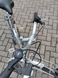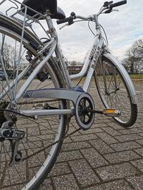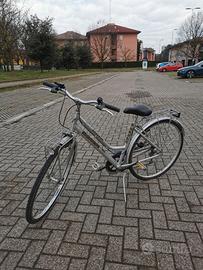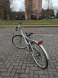 Bici da donna/unisex Samar silver/argento, modello city/ibrida con telaio comodo e linea elegante. Dotata di portapacchi posteriore, parafanghi completi, fanale anteriore tondo e catarifrangenti rossi. Freni V-brake, 6 marce Shimano, sella nera ergonomica, ruote 26". Copertoni usurati da cambiare - se vuoi, sono disponibile a montarne di nuovi io al prezzo aggiuntivo di 10 euro, così sarà subito pronta da usare! Buone condizioni generali, ideale per uso urbano quotidiano.