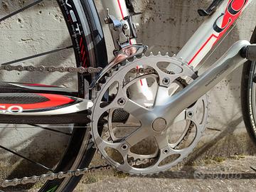 Foderi posteriori e forcella in carbonio monoscocca. Telaio taglia 52 sloping. Cerchi in alluminio, altezza 30mm, anteriore 20 raggi, posteriore 24 raggi schiacciati marca Velvet. Deragliatore anteriore Campagnolo Deragliatore posteriore Shimano 105 Pacco pignoni 10 velocità dal 13 al 28 Corone anteriori 52/39 Manubrio CCC – CNCi Leve freni RS Sunrace Freni Shimano 105 Reggisella FSA in carbonio Sella fi’zi:k Antares scanalata Versus evo Peso 8,4 Kg. Ottimo stato, possibilità di visione. Non spedisco, solo ritiro, grazie.