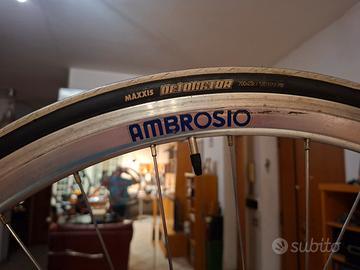 Vendo bici corsa Olmo anni 90, taglia 52; come da foto. Tubi Oria vanadium; freni cambio movimento sterzo pignoni etc campagnolo serie mirage/veloce (da 8); bxa drive 53/39 e dietro 13/26. Cerchi Ambrosio tqb futura, manubrio europa 2 e pipa ITM; sella SMarco trapuntata Olmo; copertoncini ancora discreti. In aggiunta pedali clip campagnolo veloce e borsellino sottosella marchio Olmo Stato di conservazione piu che buono, ma certo che non è "mint"; telaio e forcella intatti e diritti, idem i cerchi; funziona tutto, cavi scorrevoli; qualche graffio alla vernice, andrebbero cambiati i nastri al manubrio, e fatta la piccola manutenzione annuale. È una "amatore elite" di metà anni 90, con dotazioni molto buone, più chicche di moda come i cerchi ambrosio; non ho voluto darla al negozio, che pure ci aveva messo gli occhi sopra, perché ho capito che l'avrebbe smontata. Non son stato li a pulirla con lingua e spazzolino da denti che mi sembra una presa in giro. Prezzo richiesto, su Roma, 400 €