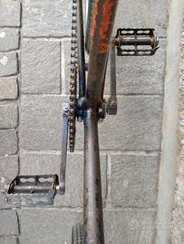 Bicicletta da corsa "Cycles Ouvrier" St. Etienne prima metà anni 20 sistemata da meccanico ciclista con attrezzi da meccanico ciclista. Il telaio immaginato in una geometria moderna è un 52x52, ok non oltre i 170cm. Tipologia di bicicletta rara in tg piccola! Forcella e ponticello posteriore non forati, nasce per freni fascettati al telaio e porta ancora tanto del blu e dell'arancio con cui è nata. Ruote con bloccaggi a papillon riraggiate con raggi sfinati INOX e rondella da cerchi R sotto la testa dei nippli. Mozzo anteriore Royal Fabric. Tutta l'ossidazione fermata con prodotto. Sfere sane e grasso nuovo nei movimenti. Porta una corona da 48 denti e una ruota libera da 20, ottimo rapporto per passeggiate non eccessivamente impegnative. Guaine disegno vecchio (avvolgimento sezione tonda, non piatta) con anima teflon (si frena con un dito), leve freni nuove e cavi nuovi INOX. Pneumatici e camere aria nuove + una di scorta in sacchetta denim da sottosella (NB sono vere camere 28x1/2 40-635). Sella corsa con occhielli interni. Scatola movimento centrale con bulloni di sicurezza e vite x ingrassaggio. Nastro manubrio cotone e manopole nuovi. Pompa Èole 🌬️ NB la bicicletta ha 100 anni, la cedo rigorosamente per collezionismo ed esposizione statica o passeggiate su fondo non estremamente accidentato come i percorsi brevi de L'Eroica o altri raduni storici ai cui regolamenti è assolutamente conforme. La bicicletta non viene spedita (ma ti vengo incontro in province vicine) e si cede alla cifra che leggi. È la migliore attualmente disponibile alla più bassa richiesta. Ad altre richieste più o meno minori ne trovi tante altre che ti potrai divertire a restaurare personalmente.