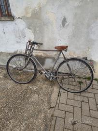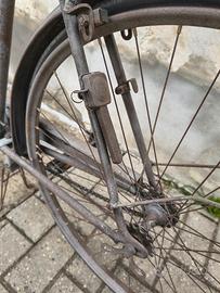 Vendo bicicletta d'epoca con portapacchi ripieghevole e portaoggetti a doppia pinza. Luce laterale a dinamo. Lucchetto incorporato alla bici. Viti di chiusura a farfalla su entrambe le ruote. Da restaurare ma completa.