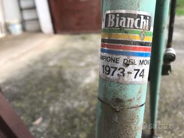 Vendo bicicletta da corsa Bianchi d epoca rekord 754 campione del mondo 1973-74originale in ogni sua parte (manubrio e cerchi originali smontati all epoca e conservati) colore originale,adesivi originali ,pedali e laccetti originali,pompa originale dell epoca ,cambio campagnolo, tubi Bianchi calibrati 1-20 misura 60-55 prezzo trattabile