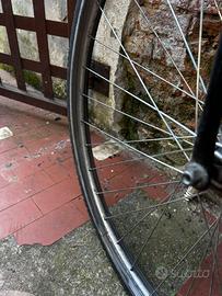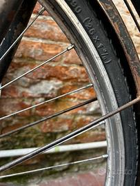La ruota posteriore è solo bucata, ma ho cambiato i cerchi, sosituendoli con nuovi in alluminio due anni fa. Nello stesso anno è stato installato anche il portapacchi anteriore, comodissimo per la vita in città. Vendo a malincuore solo per passaggio a bici pieghevole per necessità lavorative.