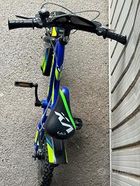 Telaio robusto, colore blu e giallo fluo, con un look sportivo ispirato alle moto da corsa/cross.