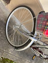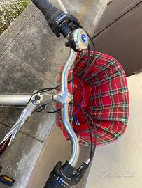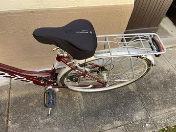 Bicicletta da città / city bike, con telaio a passo basso (step-through), adatta principalmente a un utilizzo femminile. Telaio bicolore bordeaux/vinaccia e argento, con grafiche decorative bianche. Componenti principali: Cambio: Shimano Ruote: 26" con cerchi argento e pneumatici con battistrada misto Sellino: Comfort/anatomico con coprisella in neoprene nero Cavalletto: Centrale, presente 🧺 Cestino anteriore in metallo con fodera in tessuto scozzese rosso 📦 Portapacchi posteriore in metallo argento Parafanghi anteriore e posteriore abbinati al telaio