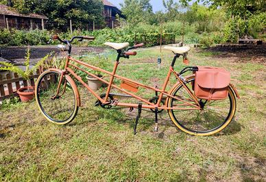 Questa bicicletta Tandem del 1965 è stata acquistata in un mercato in Marocco ed è stata sottoposta a un accurato restauro. Progettata per due persone, misura circa 55 cm di larghezza al manubrio, 91 cm di altezza al sellino e 233 cm di lunghezza. Presenta due manubri originali, un telaio color tabacco, due selle in pelle (colore crema-beige), due set di pedali (colore marrone), una borsa in pelle color tabacco e accessori realizzati a mano in Italia, oltre a numerose cromature che la rendono unica.