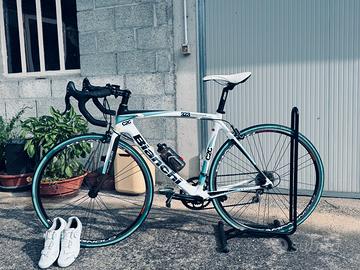 Bicicletta da corsa Bianchi vendo causa inutilizzo,come nuova, usata ppochissime volte,aggiungo paio di scarpe con attacchi marca Scott numero (43) anch'esse nuovissime.Dotata anche di cavalletto.