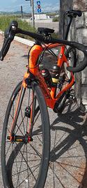 Telaio in carbonio taglia 52 con Canotto in carbonio integrato, ruote mavic ksyrium slr carbon/ceramic, copertoni vittoria zaffiro pro da 25c, pacco pignoni ultegra 11/28, cambio schimano ultegra, guarnitura ultegra compact 50/34, selle Italia slr lunghezza 28 cm, manubrio in carbonio superzero larghezza cm 40, attacco manubrio superzero lunghezza cm 10, freni tradizionali schimano ultegra, due portaborracce in carbonio, cordini dei freni e dei cambi a scomparsa nel telaio e nel manubrio. Ritiro a mano.