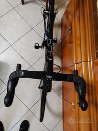 Marca Olimpia Icon Carbonio, misura 56. Gruppo ultegra 800 a disc, velocità 11, pignone 11/32. Manubrio misura 46 in carbonio integratoToseek, ruote in carbonio Palladium Velomann, altezza 33. Copertoncini marca Continental Grand Prix 5000 misura 30.