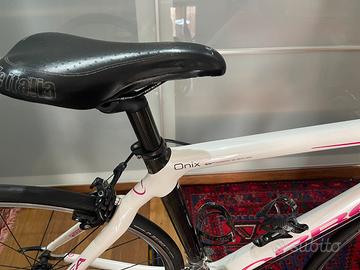 Biciclet da corsa monoscocca in carbonio, Orbea onix Dama, taglia 51. per persone di altezza di metri 1,70; cambio schiumano ultegra 10 rapporti; pacco pignoni 12/27; movimento centrale schiumano corona 50/34; sella selle Italia x2 Ldy; manubrio da city Bike e Manubrio da corsa; ruote in alluminio schiumano RS20.